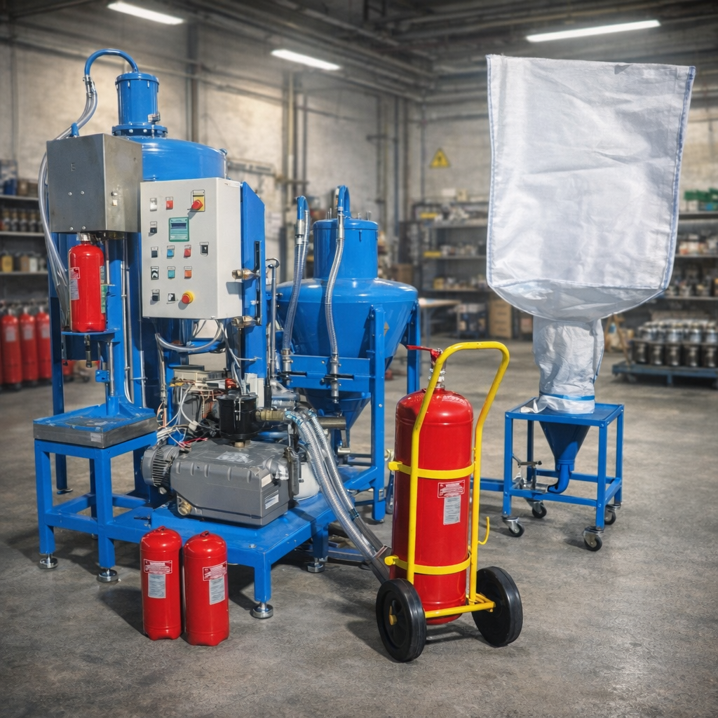 Gépek porral oltók, széndioxiddal oltók és kémiai oltóanyagok feldolgozásához, töltéséhez és gyártásához.